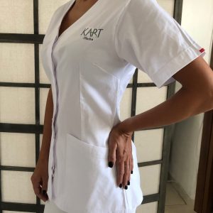 Удобный и практичный рабочий халат для косметологов, мастеров педикюра и маникюра, с логотипом KART. Изготовлен из прочного, дышащего материала, не вызывающего дискомфорта при работе. Ткань используется при пошиве медицинской одежды. Произведен в Израиле, компанией UNIDRESS. Внешняя сторона изделия гладкая и устойчивая к загрязнениям, хлопковая составляющая придает ощущение комфорта.
